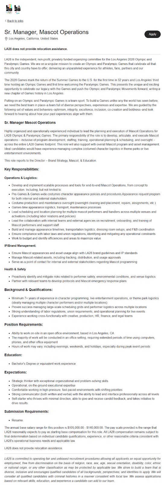 Actual Job Posting - Sr. Manager, Mascot Operations - LA 28 OlympicsThe Philly Phanatic's boss is about to get poachedShrinkedInNov 05, 2025ShareGimme an “S”! Gimme a “U”! Gimme a “B”! Gimme an — Oh, just Subscribe already. Subscribe